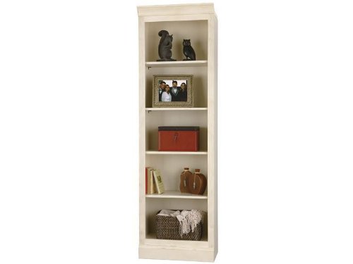 This stately wall storage unit features a fluted front frame and features a wrap around pediment on the front only. There is plenty of space to showcase your treasures with four wood shelves. Three of the shelves are adjustable. Finished in Antique Vanilla on select hardwoods and veneers. Adjustable levelers under each corner provide stab